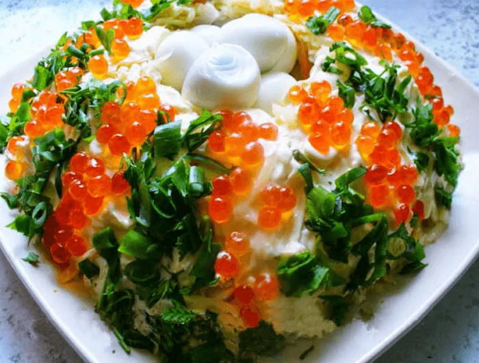 - Сверху салат можно украсить черной и красной икрой, или какой-нибудь одной из них. А также не забыть украсить зеленью, придав ему подобие венка.
