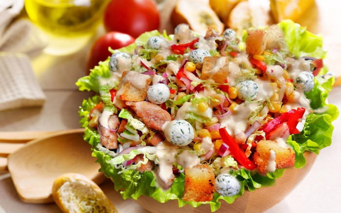 - Салатные заправки лучше добавлять в готовый салат перед подачей на стол, воспользовавшись для этого большой посудой – в ней удобнее перемешивать.
