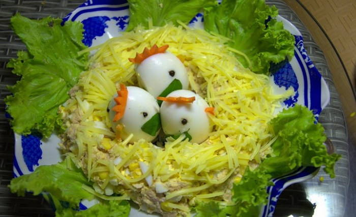 - В самую серединку посадите птенцов. Их сделайте из обычных куриных яиц, гребешки и клювик соорудите из морковки. Глазки можно сделать из черного перца. А вот крылья из любой зелени или лаврового листа. Сверху можно присыпать тертым сыром, чтобы было еще веселее.