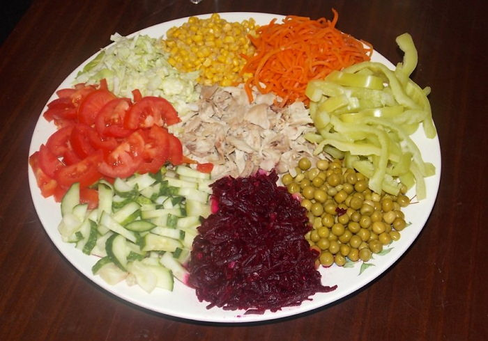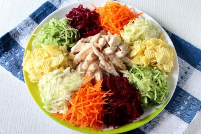 - Нарезать курицу полосками. Выложить на сервировочное блюдо свеклу, морковь, капусту, огурцы, картофель и курицу секторами в виде цветка.