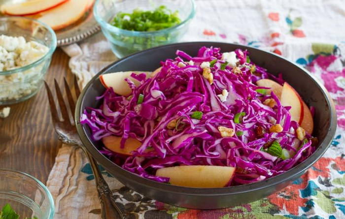 - Чтобы приготовить салат из синей капусты с майонезом по-польски, зелёный лук надо мелко порезать, а яблоки освободить от зёрен, кожицы, крупно натереть.