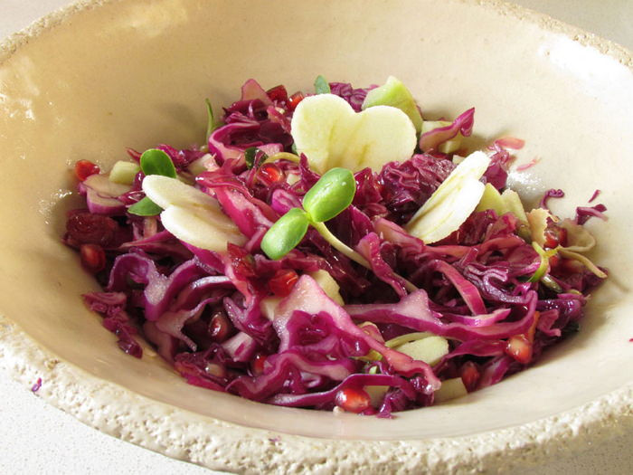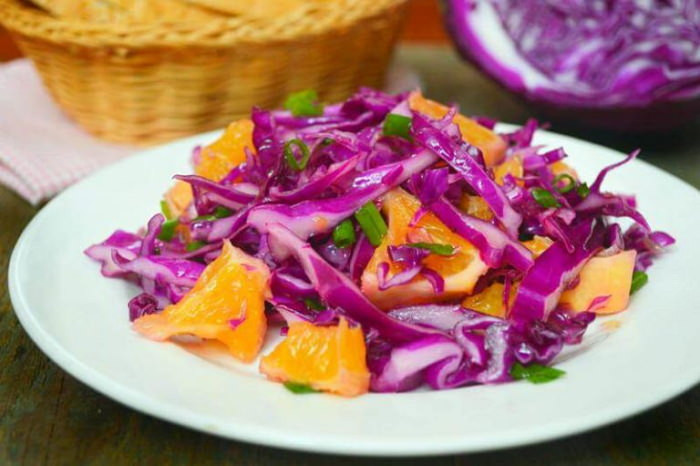 - Необычными добавками к закуске станут свежие яблоки, спелые груши, грецкие или кедровые орехи. Хорошо сочетаются с красной капустой сельдерей, морковь, цитрусовые. Для большей выразительности добавляют сыр фета, миндаль, тыквенные или кунжутные семечки. Из более сытных компонентов – курица, отварной язык, копченое мясо, соленая красная рыба.