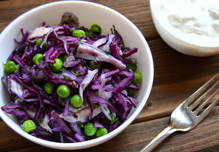 - Готовый салат из синей капусты с майонезом по-польски переложить в салатник.
