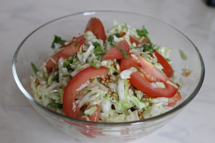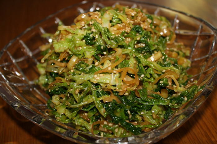 - Поджарить кунжут, посыпать салат. Все хорошо перемешать. Салат с савойской готов!