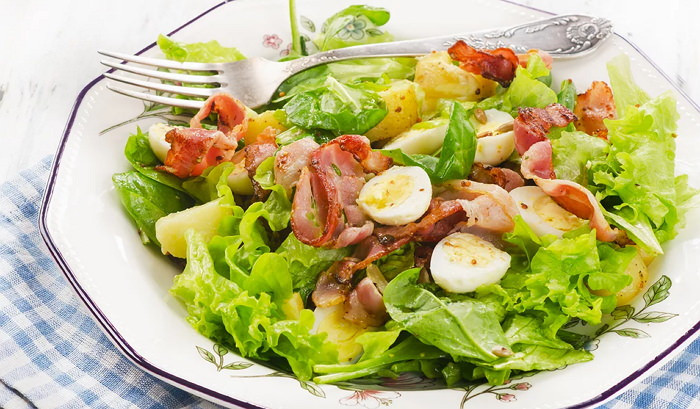 - Бекон нарежьте тонкими пластинами, обжарьте на оливковом масле, красиво выложите на капусту.