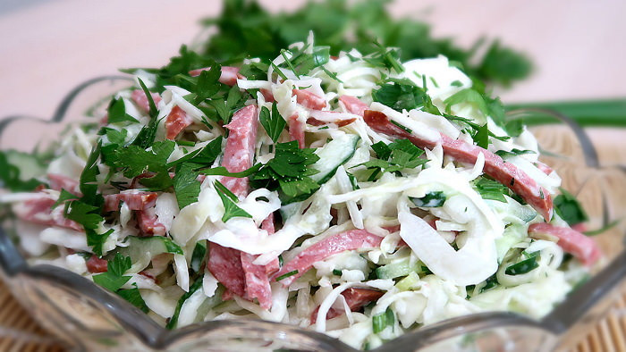 - Добавьте в миску сметану и засыпьте соль. Помешайте салат с капустой.