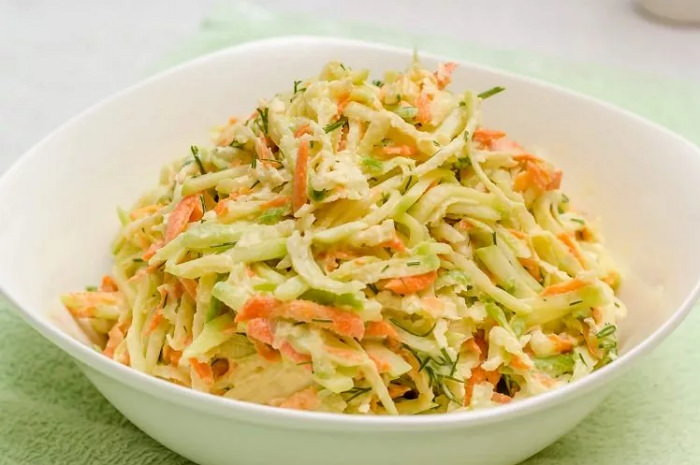 - Отправляем овощи в салатник, добавляем соус из сметаны и майонеза. Перемешиваем. Салатик готов.