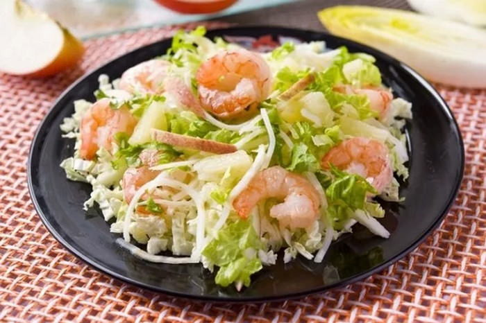 - Аппетитный, сытный салат с савойской капустой, грибами и креветками готов.