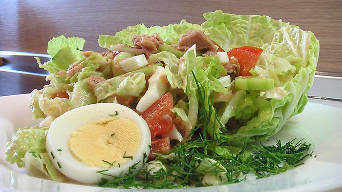 - Яйцо отварите вкрутую, разрежьте на 4 части, положите в середину салата.