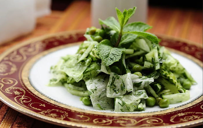 - При подаче выложить салат в салатник, посыпать семенами укропа, украсить веточкой петрушки.