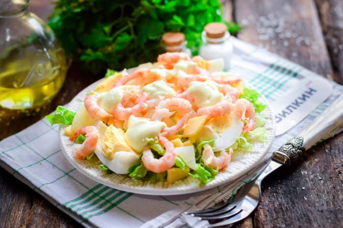- В салатник положить все ингредиенты. Добавить майонез и хорошо перемешать. Вкусный салат с креветками готов!