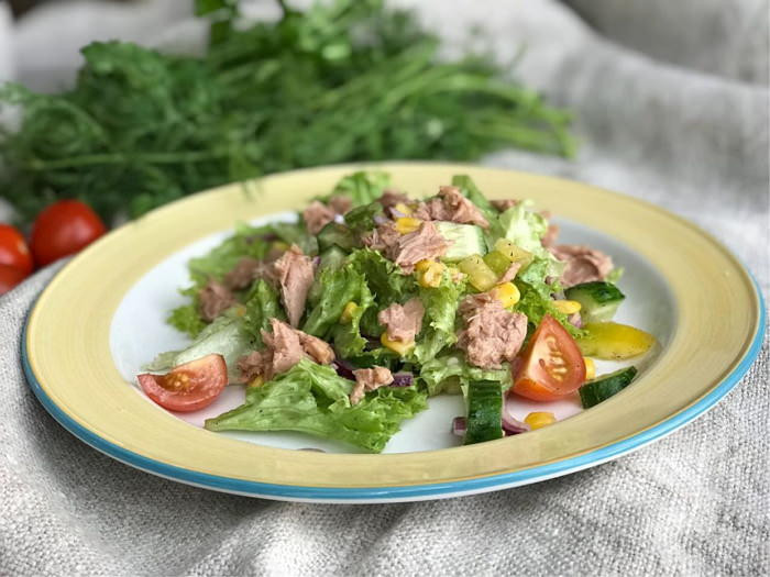 Сытный салат с замечательным сочетанием рыбы и кукурузы может стать вкусным обедом. Готовится он быстро поэтому внезапное прибытие друзей и родственников не станет для вас проблемой.