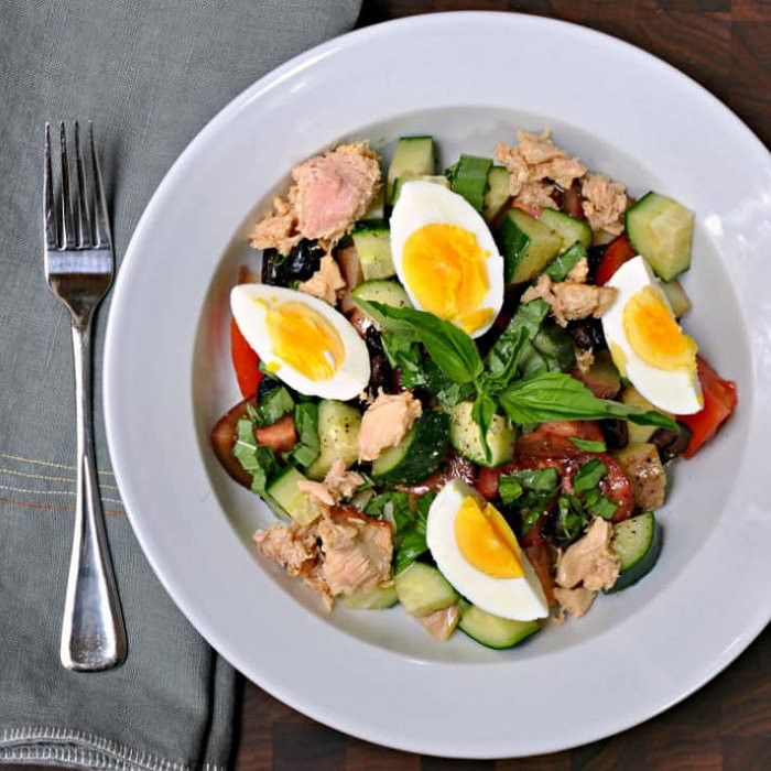 - Берем большую тарелку. На дно выкладываем листья салата или рукколы, по кругу кладем дольки огурца, в середину выкладываем помидор, на него — лук, а сверху горкой кладем тунца, декорируем дольками теплого яйца.