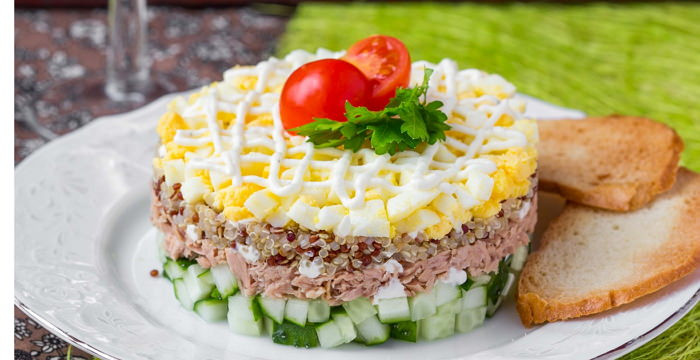Прелесть слоеных салатов в том, что каждый из них выглядят, как настоящий торт, даже если приготовлен из самых простых продуктов. Поэтому такой салат как этот из тунца и свежих огурцов смело можно добавить в праздничное меню.