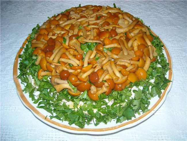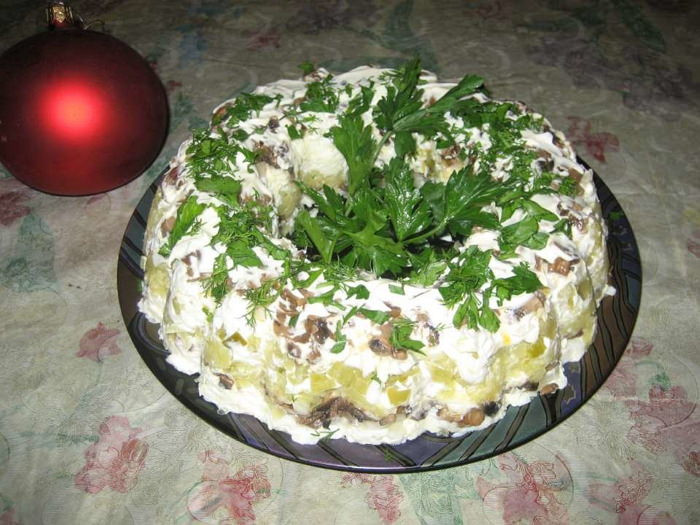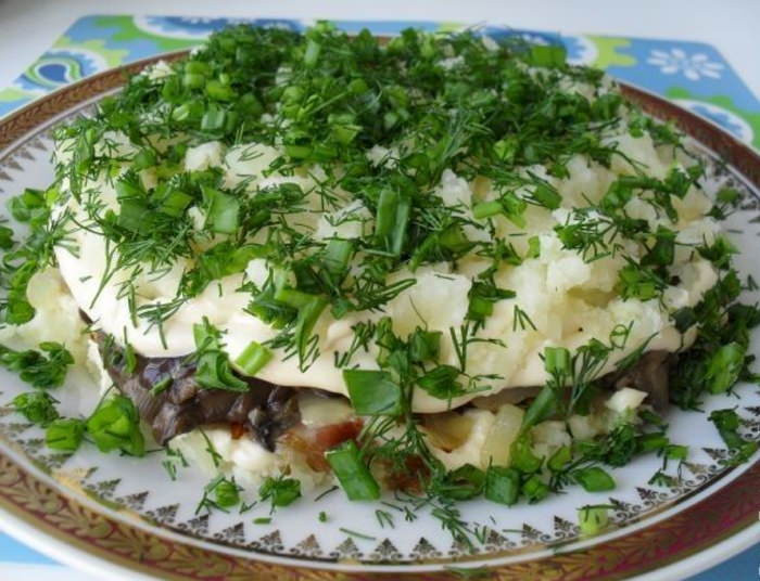 Слоеный салат с маринованными грибами