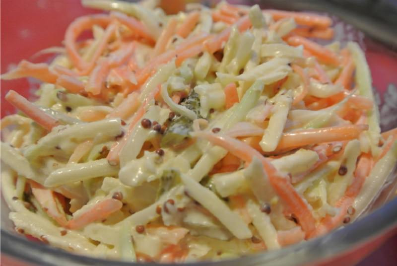 - Переходим к соусу. Смешай сметану, горчицу и измельченный чеснок. Посоли и поперчи по вкусу, заправь салат.