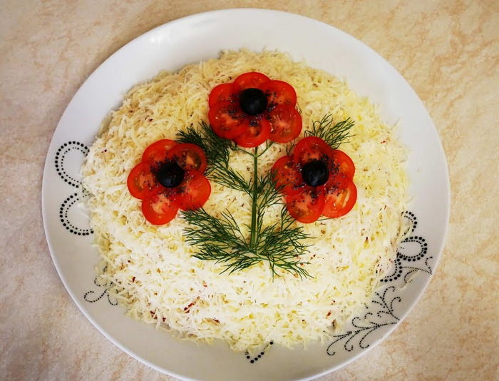 - Весь салат засыпать тертым сыром. Из помидор вырезать кружочки и сложить из них цветы. В середину вложить половинки маслин. Добавить зелень укропа. Дать салату настояться пару часов в холодильнике.