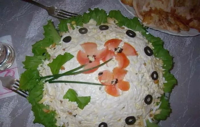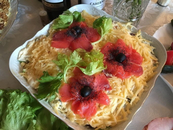 - Выложить в салатник. Посыпать сыром, тёртым на средней тёрке. По краю выложить зелёный лук, петрушку и оливки. Украсить салат маками из рыбы. Маки оформить оливкой, семенами мака и петрушкой. Охлаждаем салат перед подачей на стол.