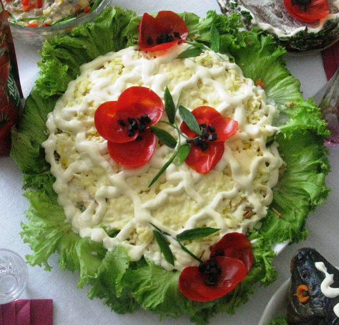 - Перед подачей на стол оформить салат вырезанными из помидоров лепестками внахлест, в центр каждого цветка положить маслину и тертый желток, украсить салат зеленью.