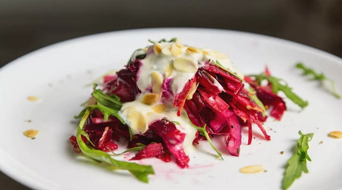 - Отдельно соединить сметану с горчицей. Соединить свеклу с орехами и заправкой. Перемешать. Украшаем салат по желанию и подаем к столу.