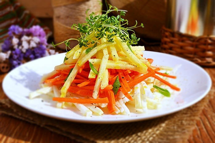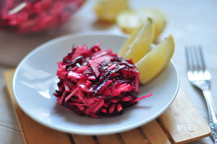 - Яблоки, свеклу и редиску натереть на крупной или корейской терке. Посыпьте овощи молотым душистым перцем, солью или травами. Дайте пропитаться и настояться в течение 20-30 минут.