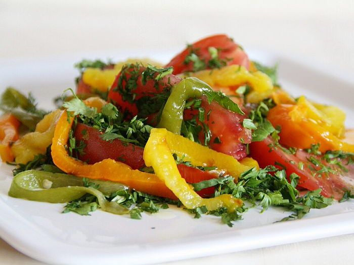 - Сладкий перец нарезаем крупной соломкой. Все ингредиенты смешиваем и поливаем набольшим количеством оливкового масла.