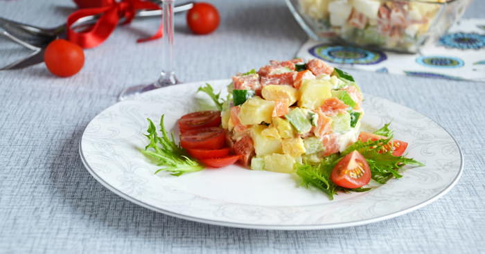 Салат с красной рыбой чаще всего можно увидеть на праздничном столе, однако при желании вполне можно позволить себе полакомиться им и в обычные будни. Салаты с красной рыбой могут быть слишком простыми или чрезмерно оригинальными, а также холодными либо теплыми. А в качестве заправки к ним могут выступать сливочный соус, лимонный или лаймовый сок, оливковое масло, майонез.
