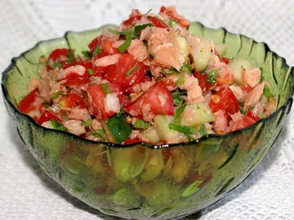 - Рыбку очищаем от костей, режем очень мелкими кусочками. Смешиваем все ингредиенты, заправляем оливковым майонезом. Посыпаем салат рубленой зеленью. Украсить блюдо можно помидорами.