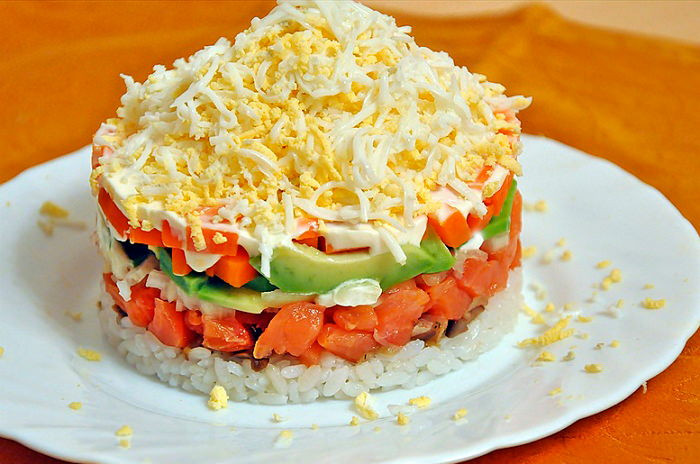 Салат Дальневосточный с красной рыбой – какая бы рыба ни была выбрана для салата, успех блюда будет обеспечен, если следовать правилам приготовления и заходить на кухню с хорошим настроением: именно так и стоит готовить салаты с красной рыбой. Настоящее изысканное блюдо, которое можно запросто поставить на праздничный стол, ведь оно такое интересное по составу ингредиентов. Оно послужит не только украшением, но и очень вкусной и сытной едой.