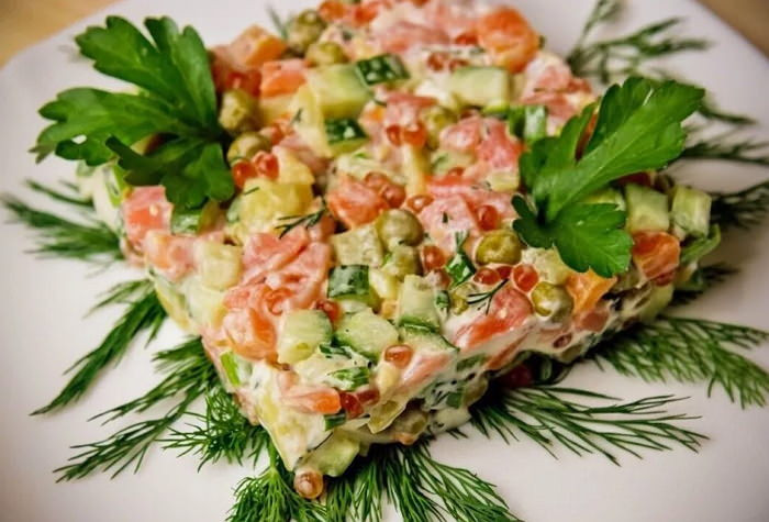 Для украшения праздничных салатиков с красной рыбой достаточно часто используется красная икра – она помогает сделать готовое блюдо более ярким и эффектным. Особенно здорово получится, если приготовить слоеный праздничный салат и украсить его сверху яркими зернышками красной икры. Привлекательный внешний вид и изысканный вкус салатов с красной рыбой никого не оставят равнодушным!