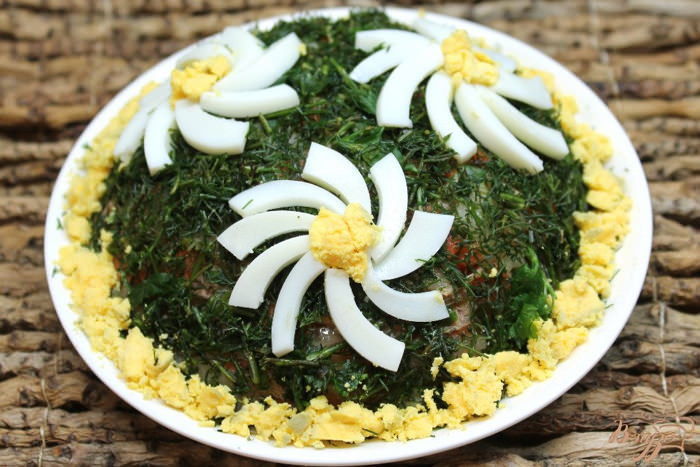 - Смазываем верхний слой майонезом и посыпаем рубленой зеленью — луком и укропом. Делаем желтую тычинку ромашки — для этого трём на мелкой терке желток. Лепестки ромашки делаем из разрезанных пополам вареных яиц. Для лучшего вкуса салат пропитывается в холодильнике несколько часов и подается к столу охлаждённым.