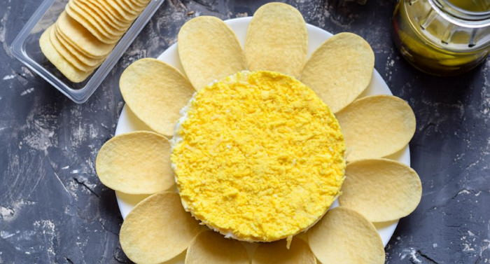 - Выложить слоями: тертый картофель, колбасу, тертые белки. Все слои покрывать майонезом и слегка подсаливать. В конце выкладывают тертые желтки. Чипсы вставляются по кругу, напоминая лепестки цветка.