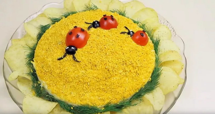 - Остается сформировать божьих коровок: черри выкладываются по поверхности салата, маслины режутся половинками и вставляются с одной стороны в качестве головки жучков, майонезом рисуются точки. Из укропа выкладываются усики, остатки используются для оформления ромашки.