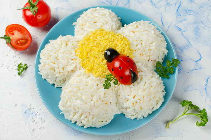 - Блюдо испортить практически нереально, но его важно красиво украсить, ведь должна получиться красивая ромашка. Ее можно сделать на всю поверхность верхнего слоя закуски или же сформировать маленькие цветочки на зеленой поляне.