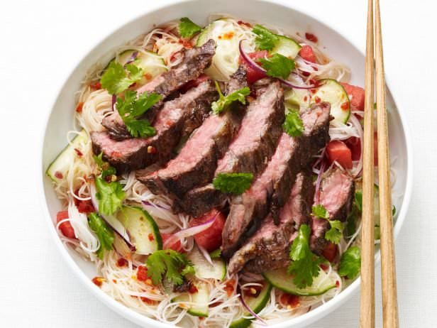 - Переложите его на разделочную доску и оставьте на 5 минут, затем нарежьте тонкими ломтиками. В салат с лапшой добавьте кинзу, оставив несколько столовых ложек, затем перемешайте. Сверху выложите стейк и оставленную кинзу.