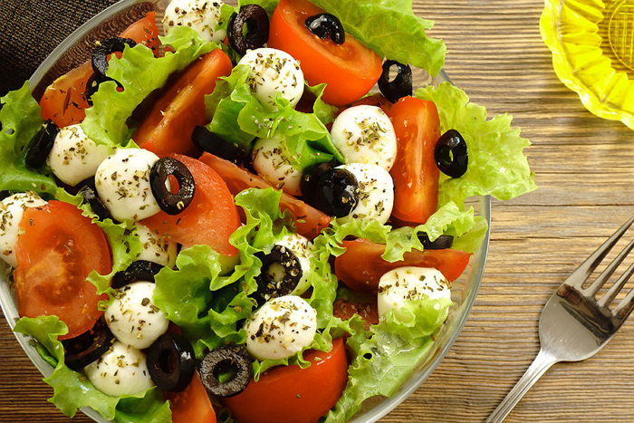 - Сверху добавляем маслины, нарезанный кубиками сыр, посыпаем мелко нарубленной зеленью. Особенную пикантность прядает базилик – но можно использовать, любую другую зелень – петрушку, кинзу. Осталось заправить блюдо оливковым маслом и лимонным соком, добавить по вкусу соль, перец– салат готов!