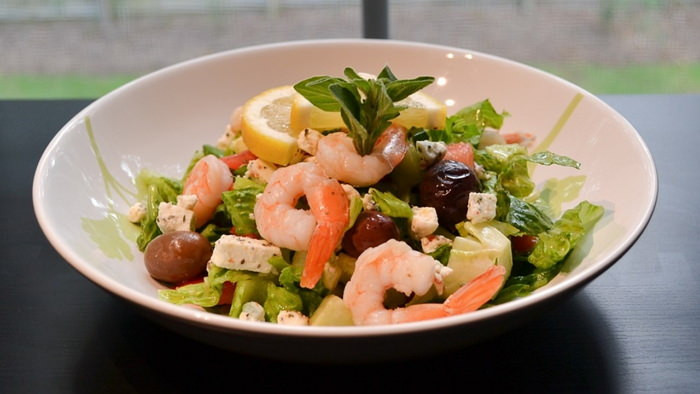 - На чашу красиво уложить листья салата. На листья салата выложить готовый греческий салат из овощей.