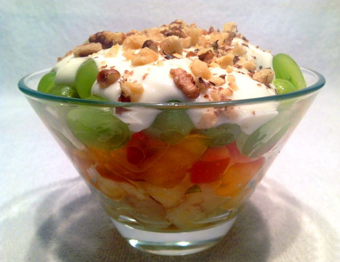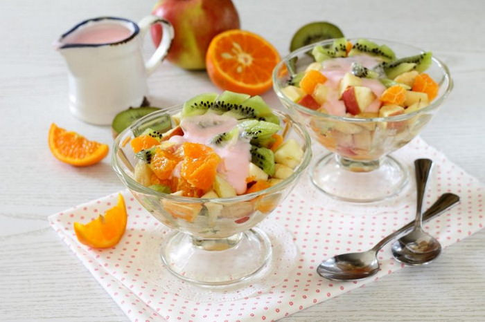 Фруктовый салат с йогуртом, наряду с медом а так же другими натуральными сладостями, без сомнения, можно назвать самыми полезными видами десертов. Салаты из фруктов, в самом деле, рекомендуется есть в первой половине дня. Так как, именно утром и днем, по мнению диетологов а так же врачей, надо есть фрукты. Конечно, если захочется сладенького вечером, само собой, можно не отказывать себе в легком и полезном десерте.