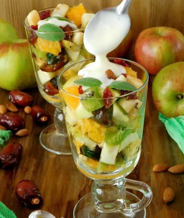 - Смешайте фрукты с натуральным йогуртом и разложите по креманкам. Украсьте фруктовый салат по своему усмотрению.