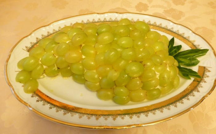 - Виноград помыть, разрезать каждую виноградинку пополам, вынуть косточки. На блюде нарисовать майонезом контур виноградной грозди. Размазать майонез тонким слоем по блюду.