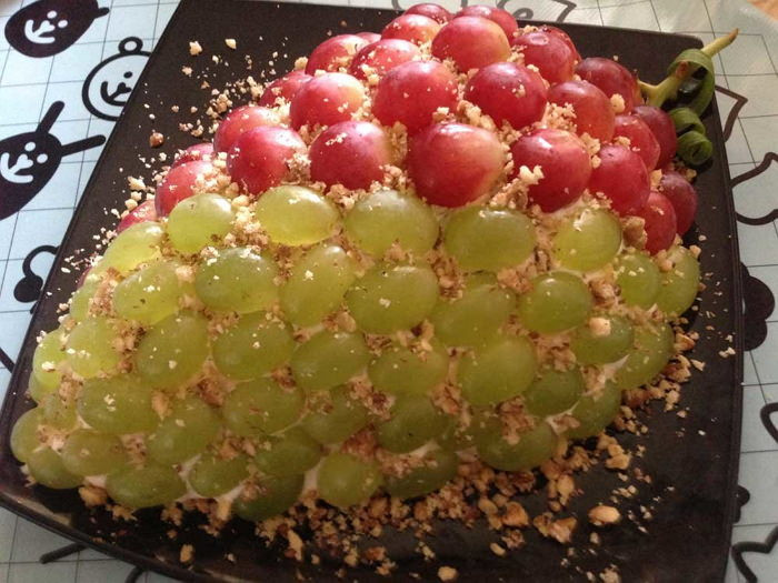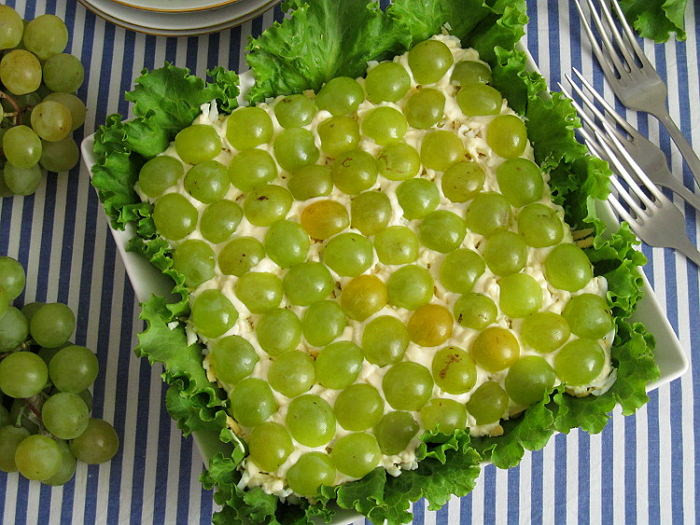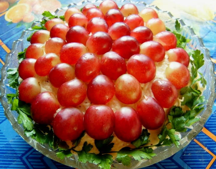 - Последним слоем выложить ягоды винограда. Если он крупный, разрезать каждую ягоду пополам. Украсить салат по своему усмотрению.