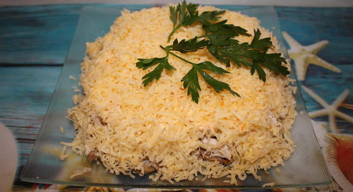 - Когда все ингредиенты будут готовы, приступаем к укладке салата. В салатнице послойно выложите все ингредиенты. Все слои, кроме последнего смажьте майонезом.