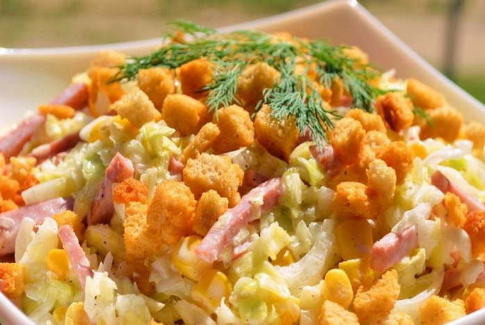 Салат с сухариками и кукурузой и колбасой
