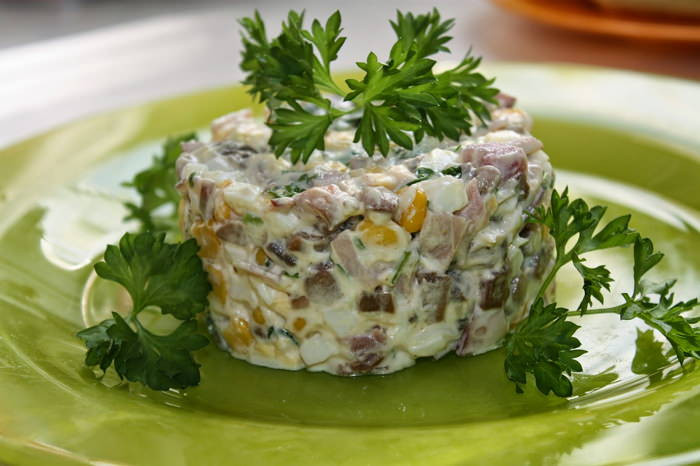 Салат из ветчины с шампиньонами и кукурузой