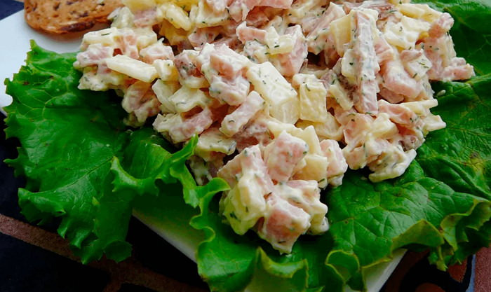 - Ветчину и плавленый сырок тоже нарежьте кубиками. Ветчину в данном салате можно заменить нежирной грудинкой, а плавленый сыр сыром сулугуни, копченным колбасным сыром или сырами твердых сортов.