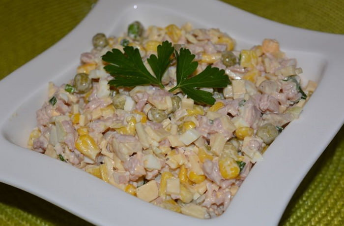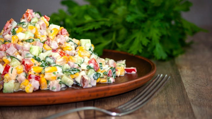 Нежный салат с ветчиной и кукурузой