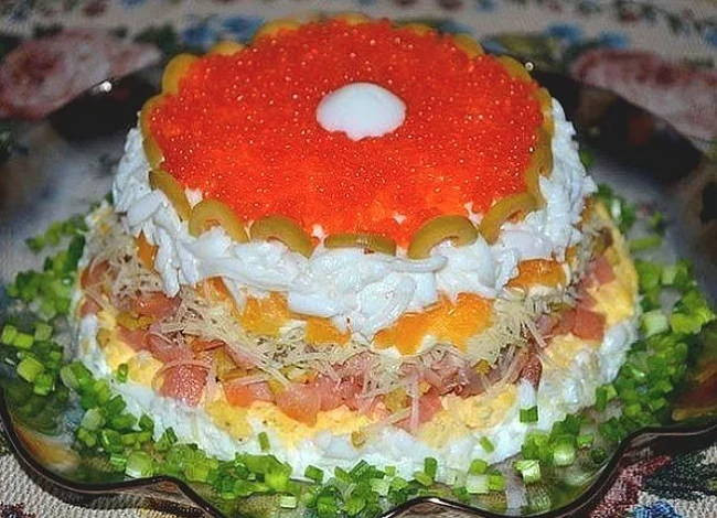 - Натрите сыр и добавьте майонез, выложите слой. Далее выкладывайте апельсин. Посыпайте белками яйца. Посолите и поперчите. Украшайте икрой, оливками. Поставьте настаиваться на несколько часов в холодильник.