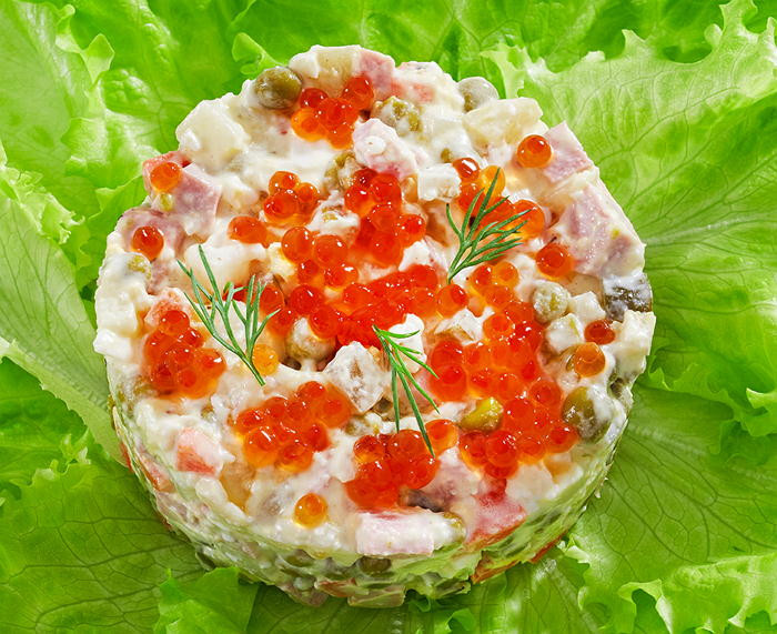 - Выкладываем салат в салатницу и украшаем икрой. В середину салатницы кладем предварительно сваренное перепелиное яйцо, оно символизирует жемчужину.