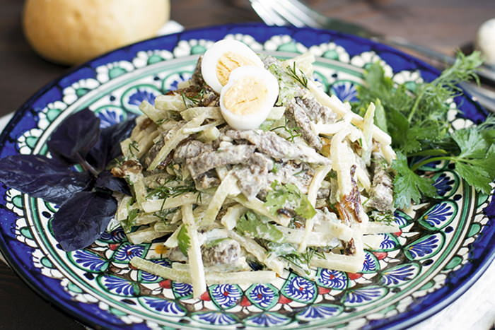 Настоящий узбекский салат перемешивают и заправляют кисломолочным продуктом — сюзьмой, по виду напоминающим густую сметану.