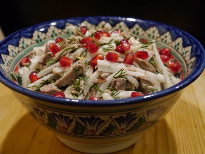 Салат готовят из узбекскоӗ зелёноӗ редьки или из белого диакона в зависимости от сезона и урожая.Ингредиенты: